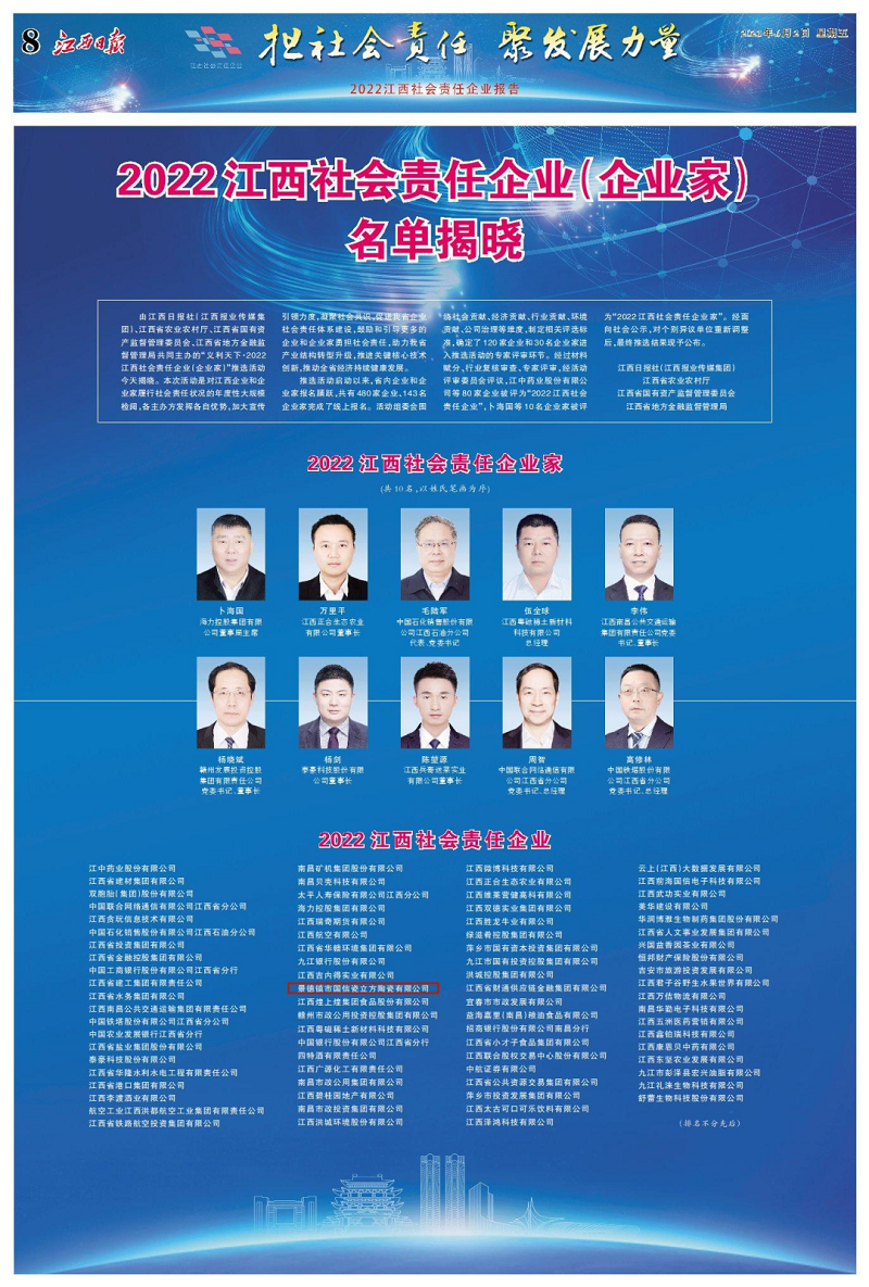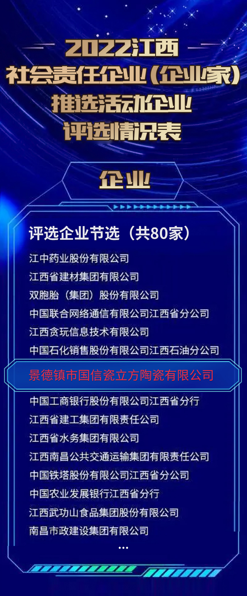 6月2日,由江西日報社(江西報業(yè)傳媒集團)、省農(nóng)業(yè)農(nóng)村廳、省國有資產(chǎn)監(jiān)督管理委員會、省地方金融監(jiān)督管理局共同主辦的“義利天下·2022江西社會責任企業(yè)(企業(yè)家)”推選活動正式揭曉,景德鎮(zhèn)市國控集團旗下國信瓷立方陶瓷有限公司從全省480家企業(yè)中脫穎而出,成為景德鎮(zhèn)市唯一入選企業(yè)。